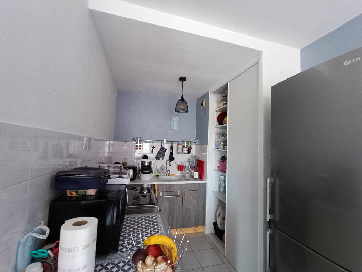 Un hall d'entrée avec une cuisine ouverte sur un salon - Une chambre individuelle, une salle de bains, et un wc individuel.