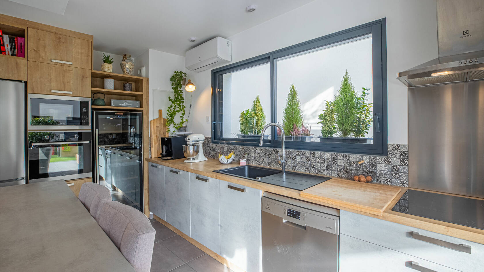 Pièce à vivre lumineuse, exposée SUD avec cuisine équipée ouverte sur le salon et donnant sur une terrasse avec espace piscine et jardin.