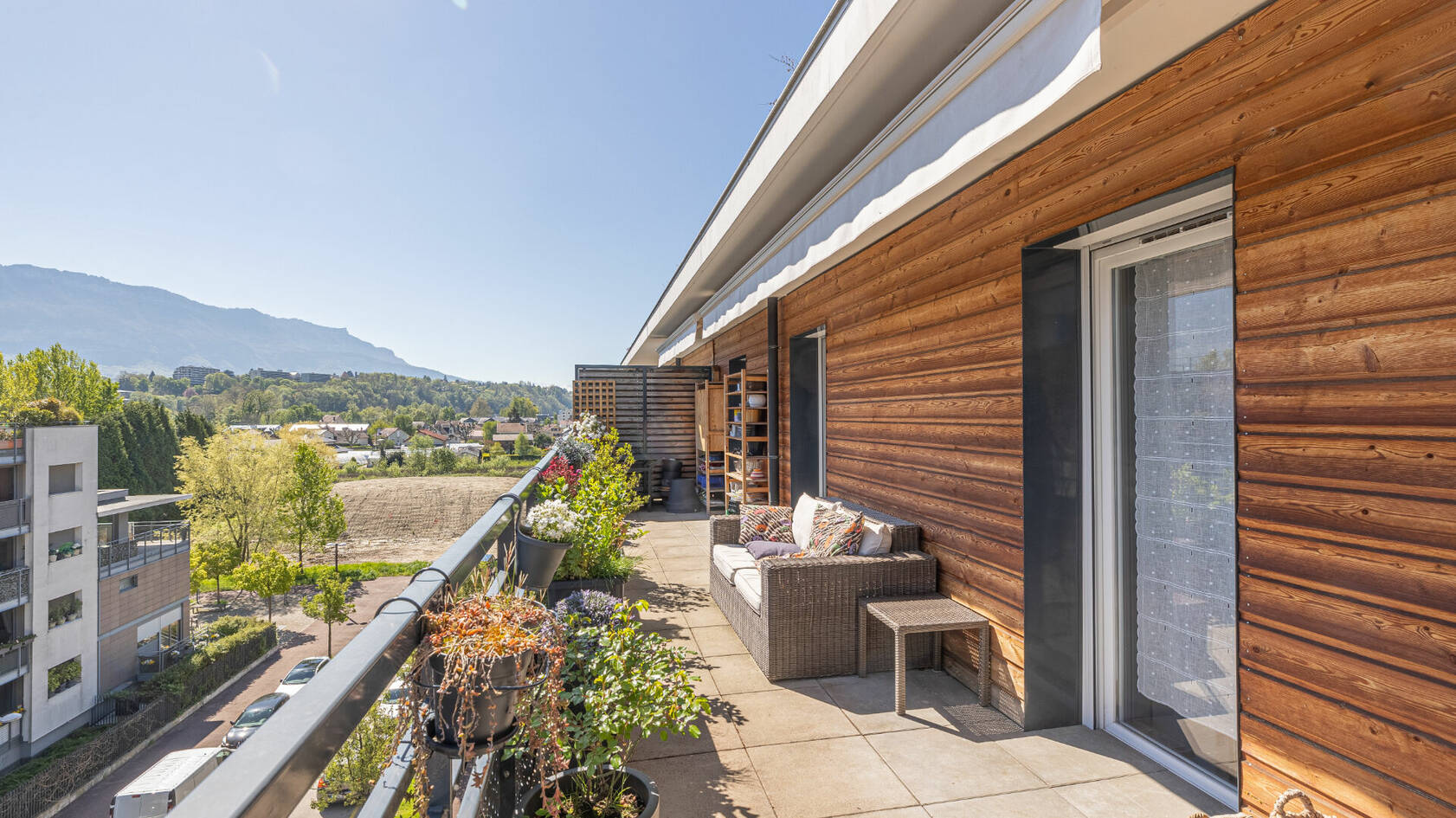 Pour profiter pleinement des splendides couchers de soleil, une terrasse côté Ouest offre une vue panoramique sur la Dent du Chat, créant ainsi un cadre idéal pour se détendre et recevoir des invités.
