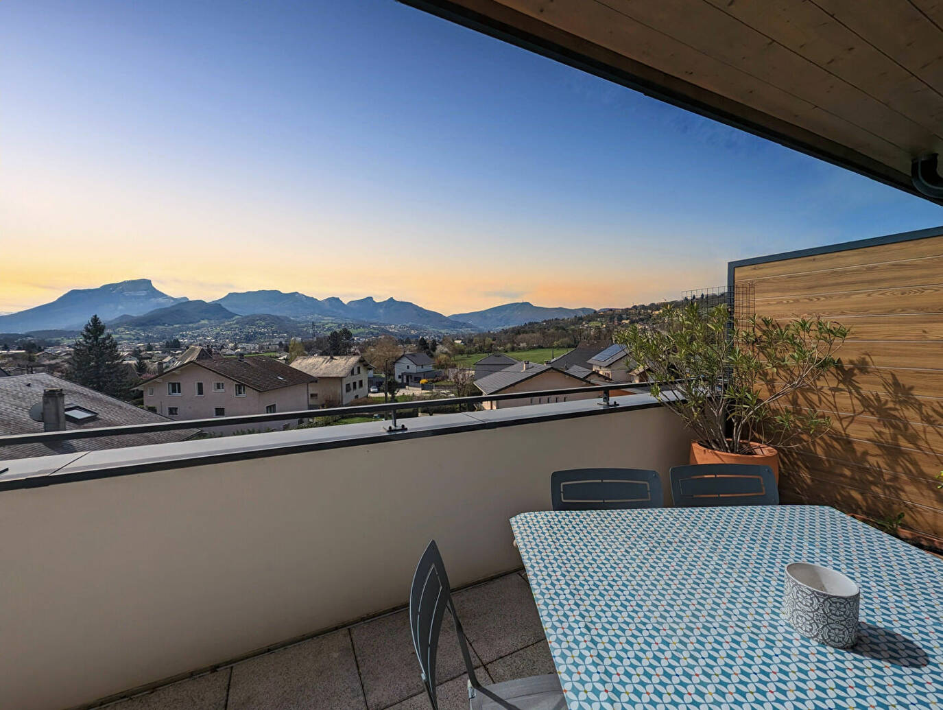 La pièce de vie s'ouvre sur une vaste terrasse de 30m2 exposée plein Sud-Ouest, offrant une vue panoramique imprenable et dégagée sur les montagnes, idéale pour profiter de moments de détente en plein air sans aucun vis-à-vis.