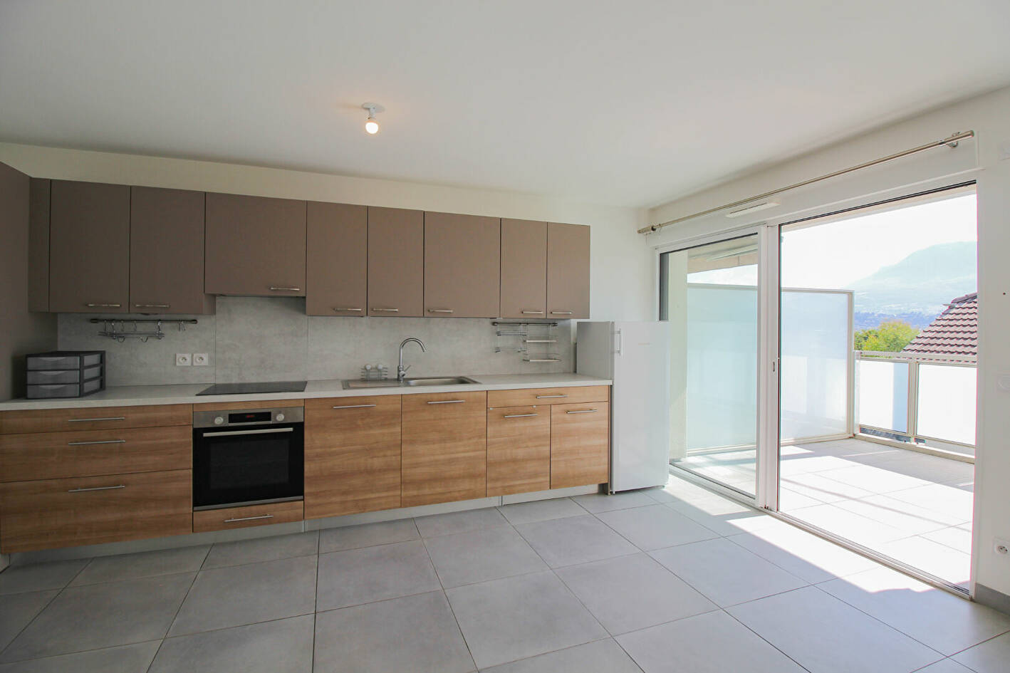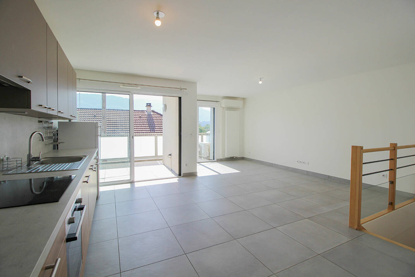 Séjour-cuisine de 30m² ouvrant sur une terrasse avec vue EST et aperçu lac.
