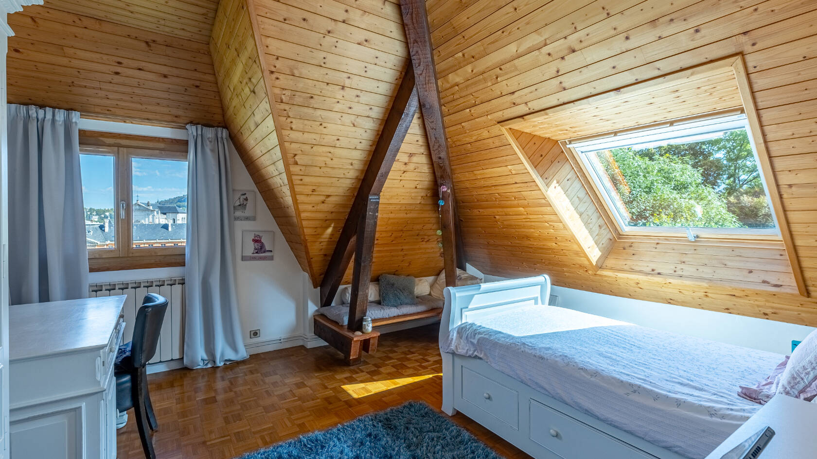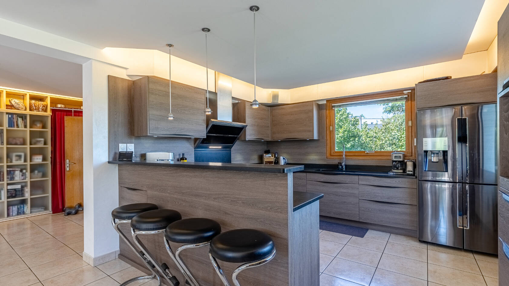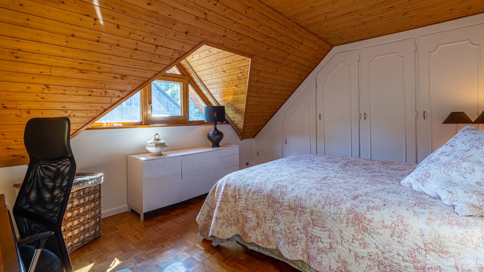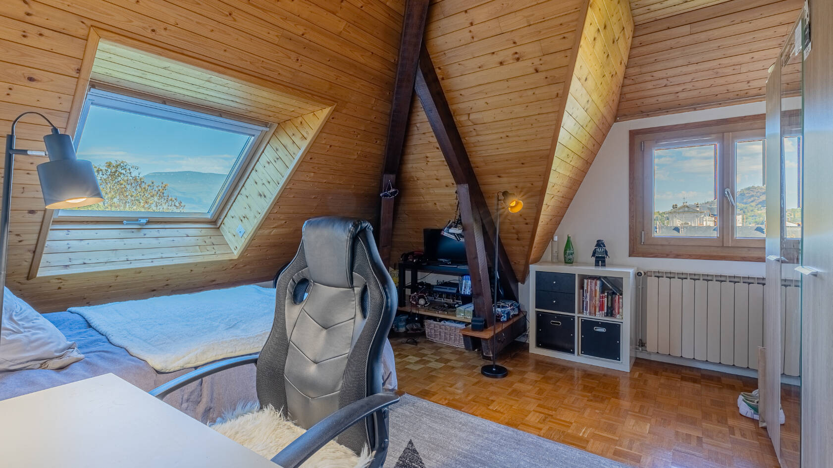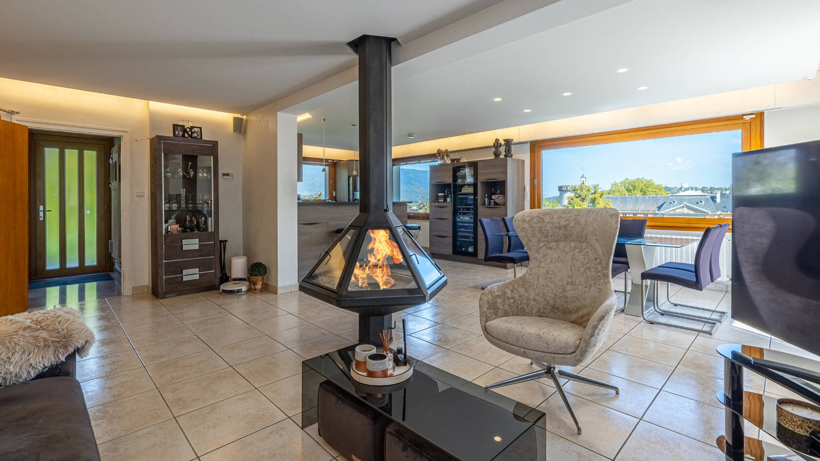 La partie habitable est composée d'un premier niveau en rez de sol avec grand espace à vivre ( 60 m2) disposant d'un salon avec cheminée, d'une salle à manger donnant sur de grandes ouvertures et offrant un panorama sur la ville de Chambery. Une suite parentale, bureau/dressing, salle d'eau avec toilette.