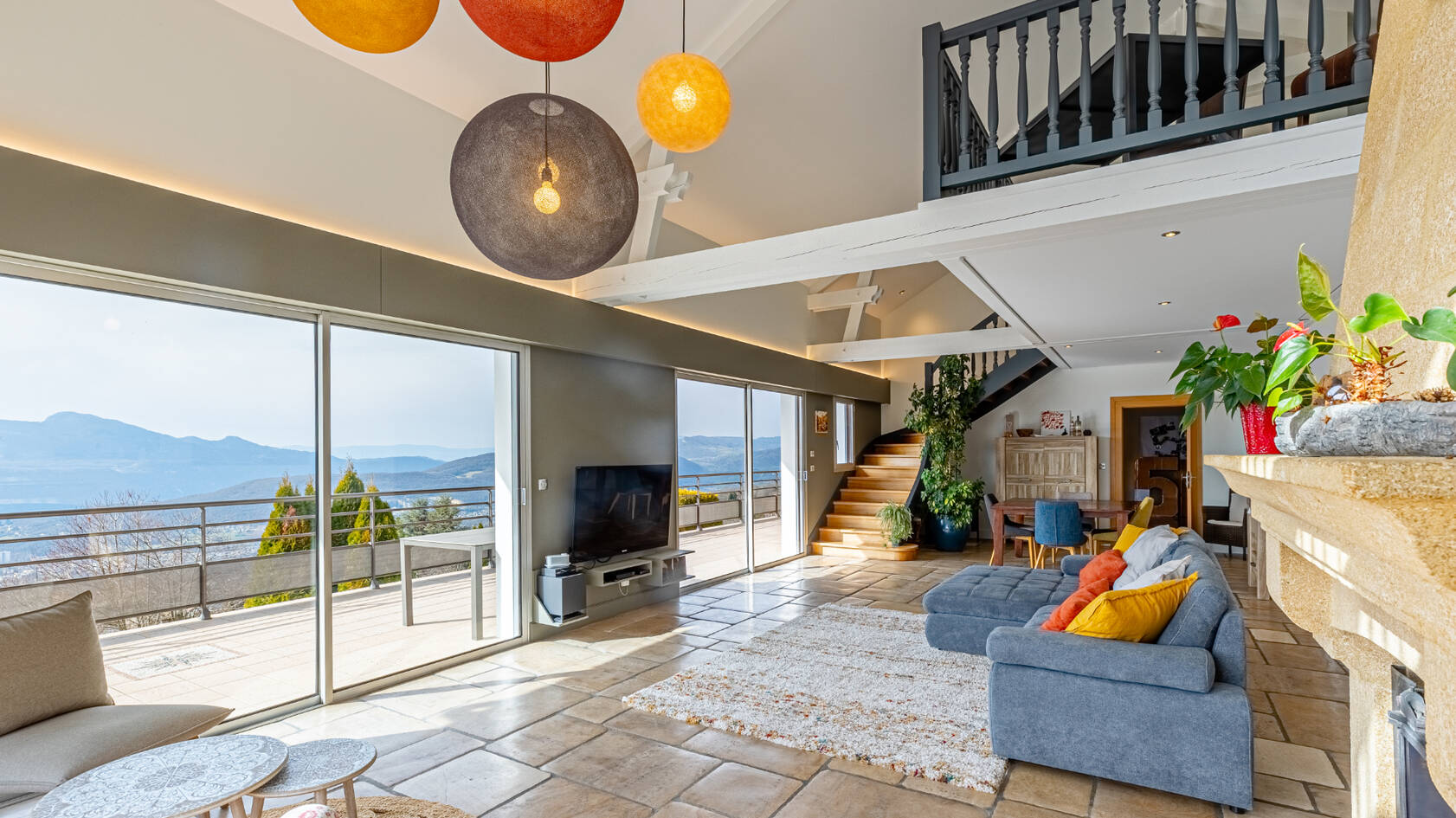 - au deuxième étage : une mezzanine ouverte sur séjour, deux salles de bains, quatre chambres dont une donnant sur un balcon et un WC séparé.