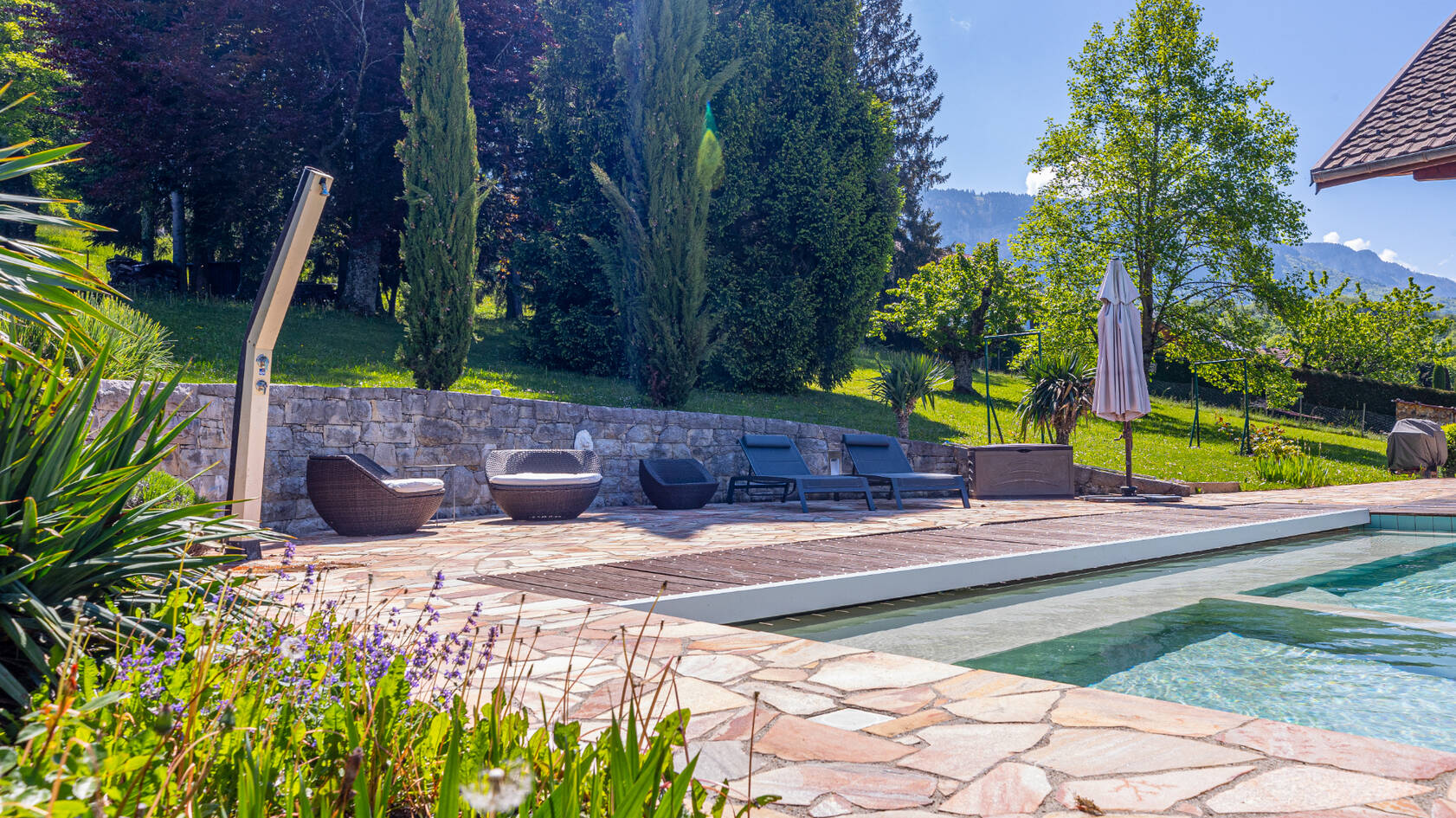 Elle est implantée sur un terrain paysagé de plus de 3000m2 avec terrasse et piscine à débordement vue lac.