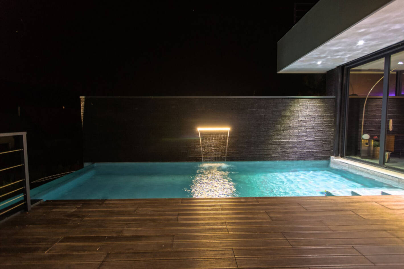 - Double-cuisine ouverte sur salon-séjour donnant sur une terrasse avec piscine à débordement.