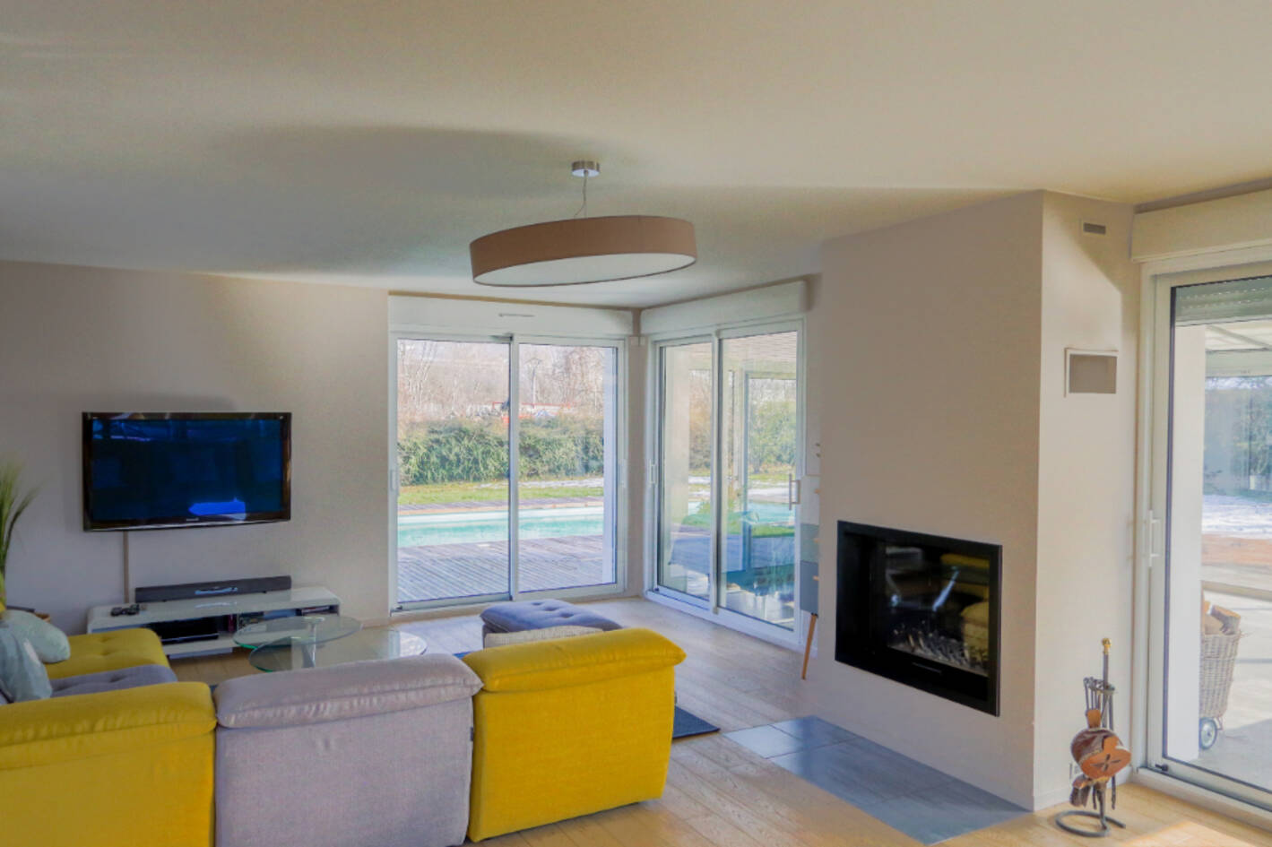 un grand salon de 45m2 et une véranda donnant sur la terrasse.