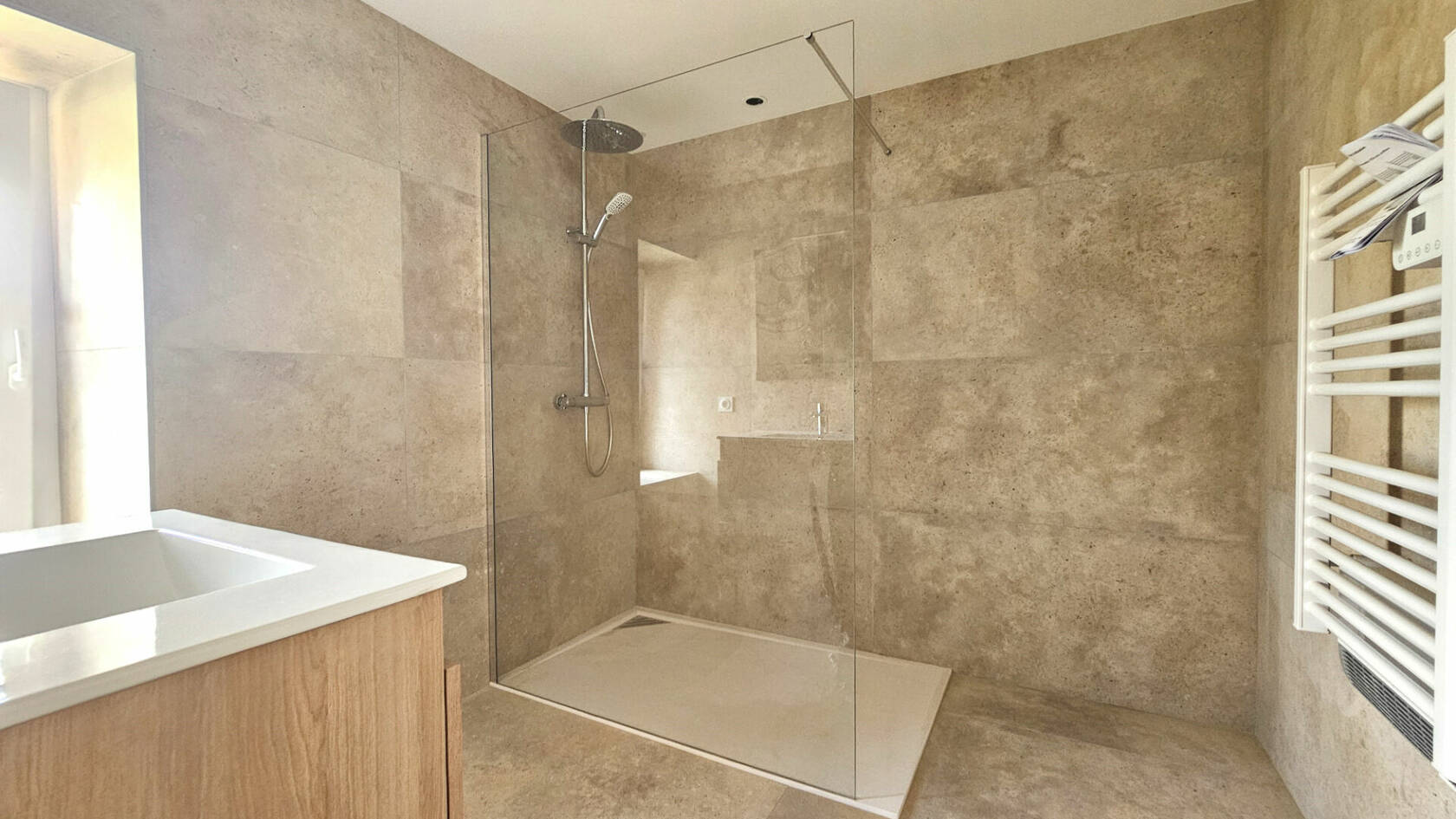 entrée sur salon- salle à manger, cuisine ouverte (non fournie), buanderie avec wc (arrivée prévue pour douche),