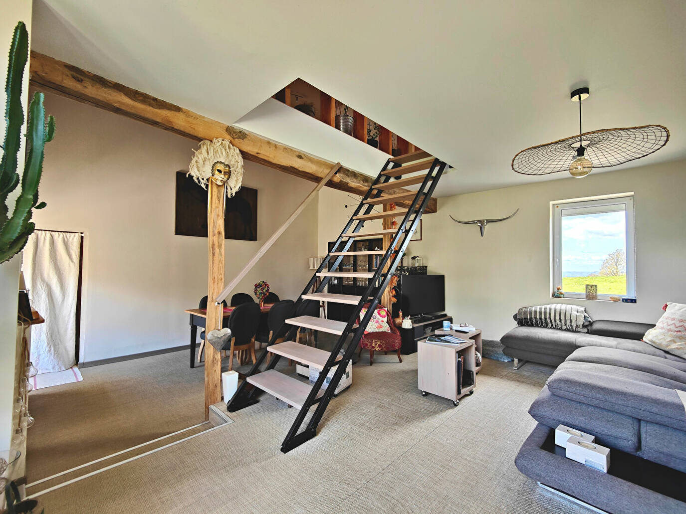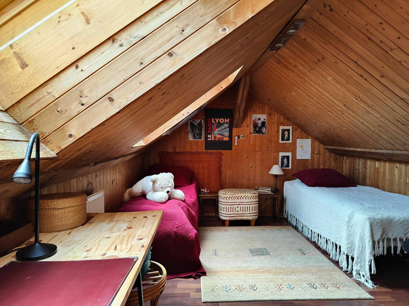 A ce même étage deux escaliers mènent à une chambre avec salle de bain, ainsi qu'à une pièce d'environ 12 m² au sol, idéale en chambre d'appoint ou espace bureau.