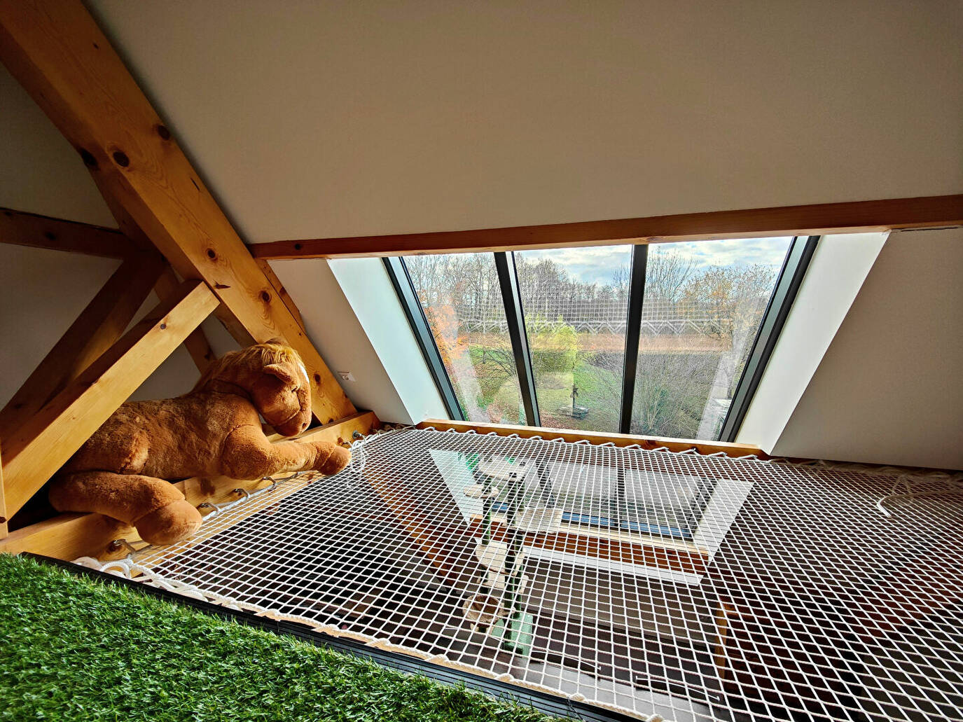 - Étage : un appartement de 110 m² avec une cuisine aménagée, un séjour avec mezzanine et filet suspendu, 2 chambres dont une avec salle de bains, 2 bureaux servant de chambres et 2 WC indépendants. Certaines pièces sont équipées de parois amovibles pour plus de modularité.