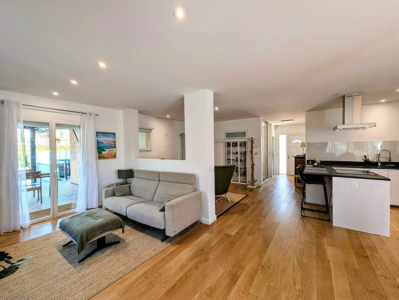 Le rez-de-chaussée comprend un salon-séjour lumineux, une cuisine ouverte équipée et un accès direct à deux terrasses aménagées avec piscine, pergola et zone de repos.