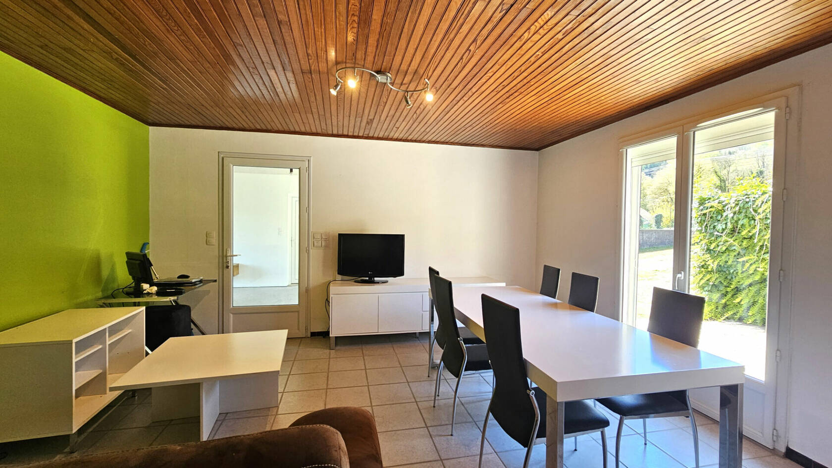 Une entrée desservant une cuisine toute équipée avec accès direct sur la terrasse, un salon tv, une salle à manger, une salle d'eau, deux chambres, un wc individuel. Une buanderie fera l'intermédiaire entre la maison et le garage de plus de 100m² idéal pour bricoleurs.