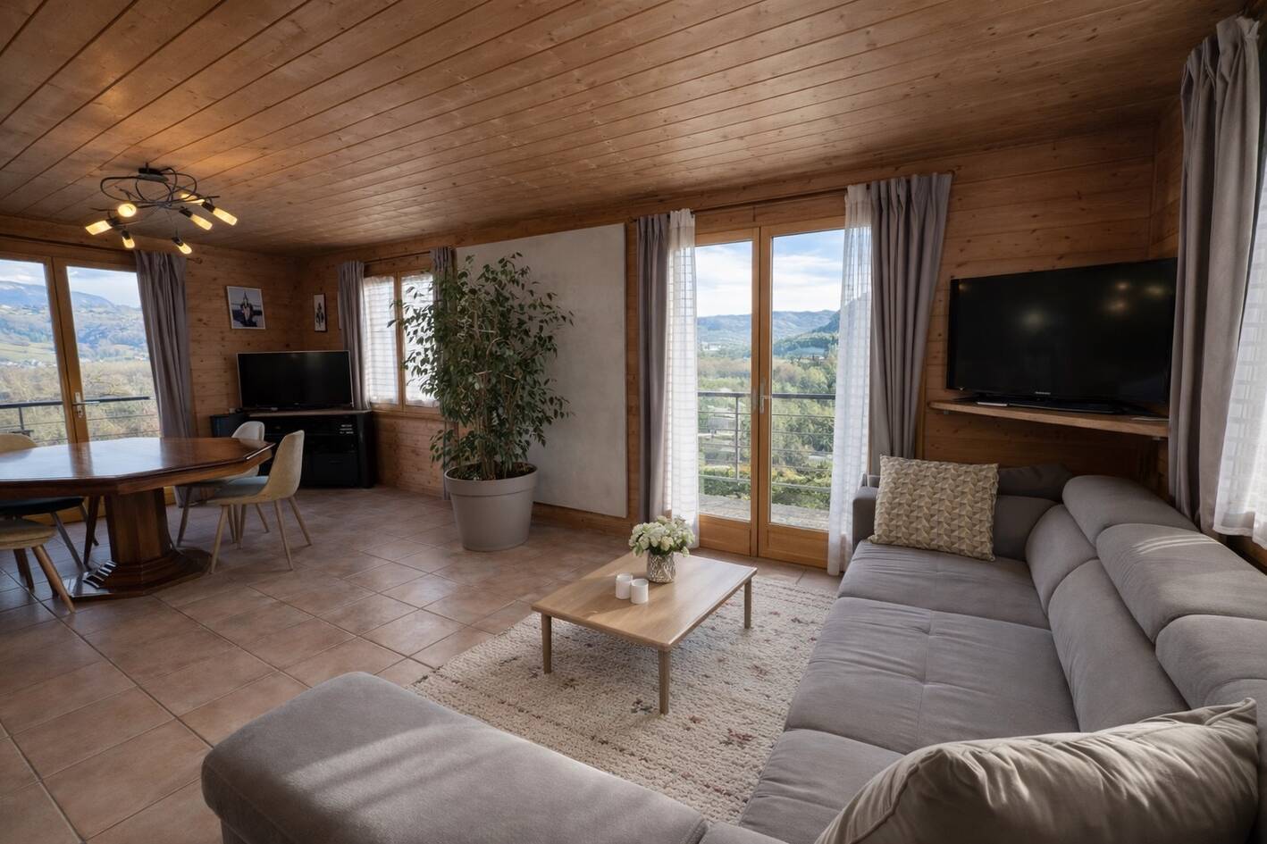 Maison ossature bois de style chalet, perchée et dominante, offrant une vue dégagée sur la vallée. Parcelle : 897 m². Surface habitable : 88 m², (163 M2 au sol) 5 pièces dont 3 chambres une suite parentale au rez-de-chaussée avec salle d'eau privative et 1 bureau ; à l'étage, une salle de bains supplémentaire. Poêle à pellets, atelier et buanderie complètent les prestations.