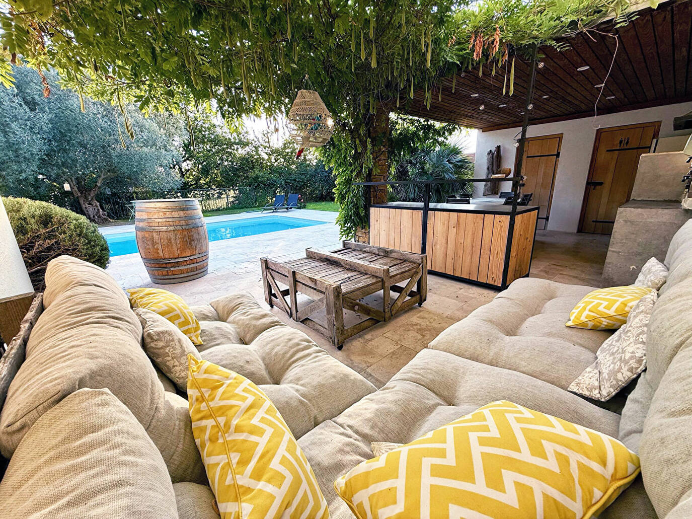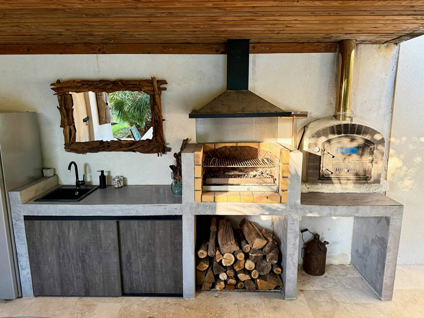 Les extérieurs sont entièrement aménagés : jardin arboré, potager, piscine chauffée 8×4 m, terrasse en travertin, douche extérieure et pool house équipé avec cuisine d'été et four à pizza.