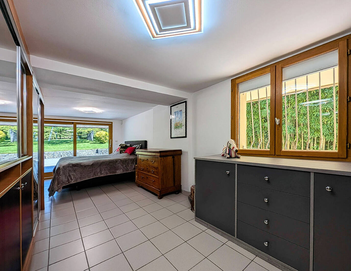 Au rez-de-jardin, un hall d'entrée dessert deux chambres, dont une avec salle d'eau, un WC, une cave/chaufferie et un accès direct à un vaste garage de 55 m². Ce niveau donne également accès à la piscine récente .