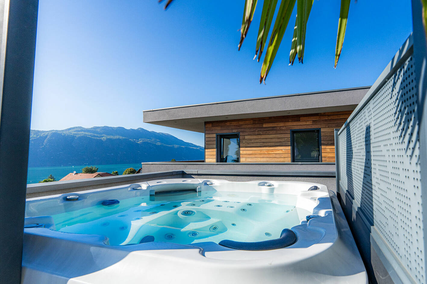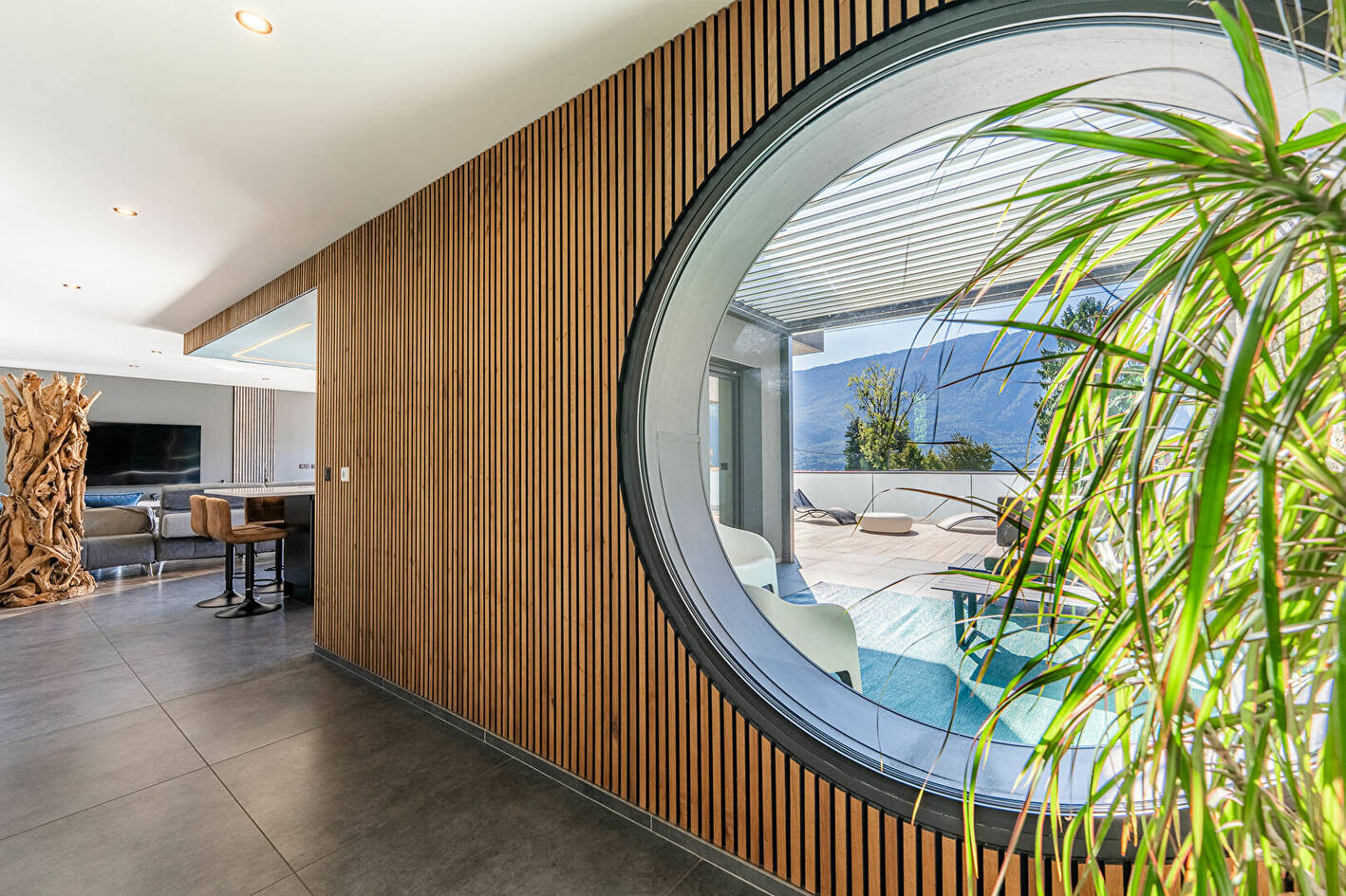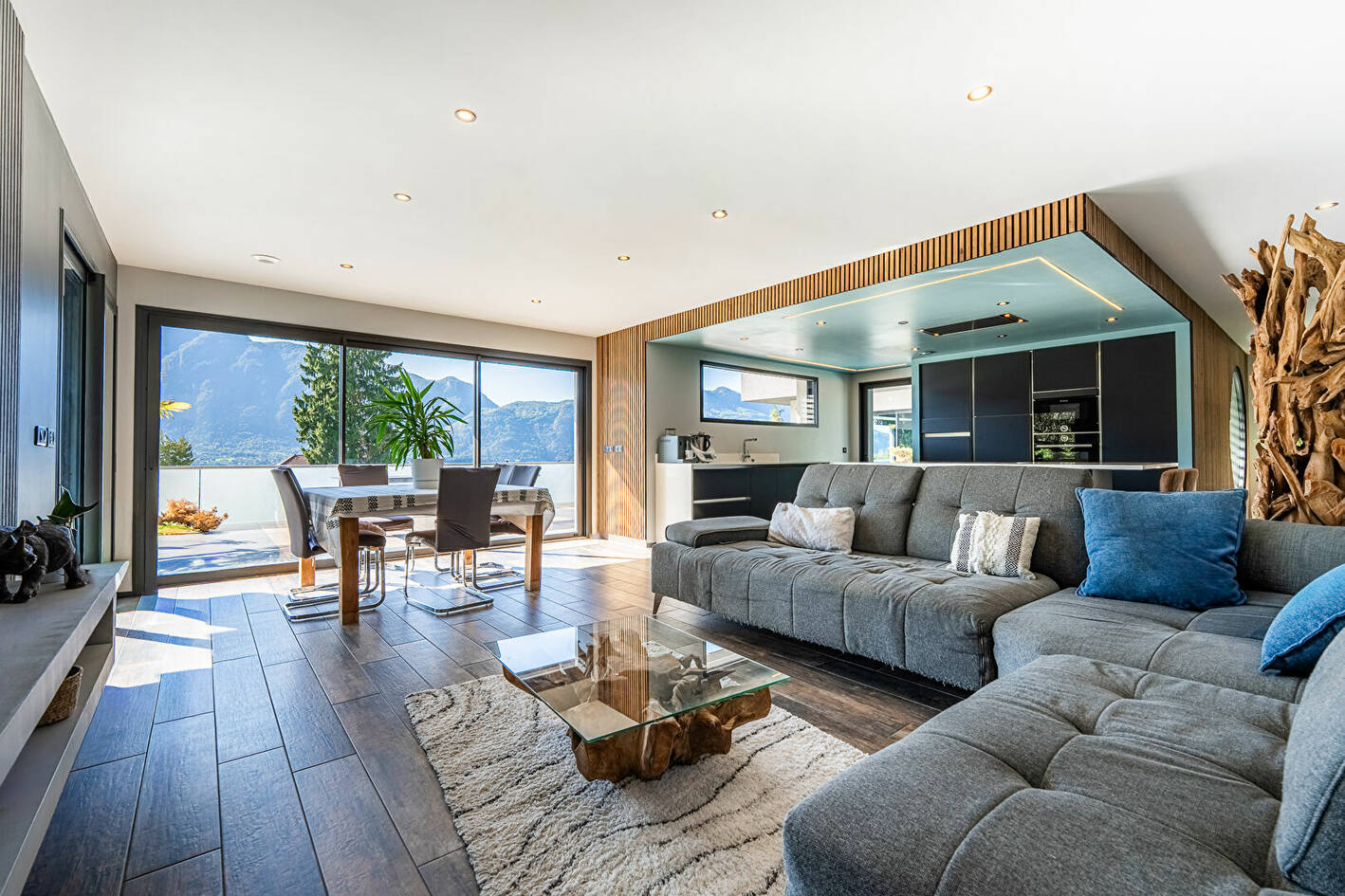Conçue avec des matériaux haut de gamme, elle offre un vaste espace de vie baigné de lumière grâce à ses larges baies vitrées , prolongé par une terrasse avec vue panoramique sur le lac du Bourget.