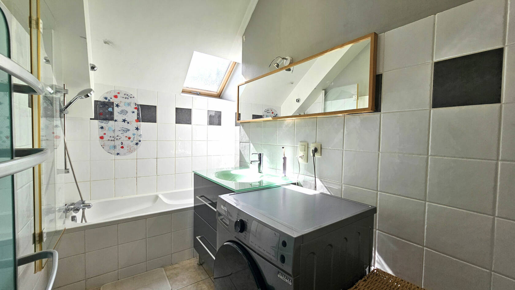 A l'étage, un palier desservant 2 chambres mansardées, une salle de bains, wc séparé.